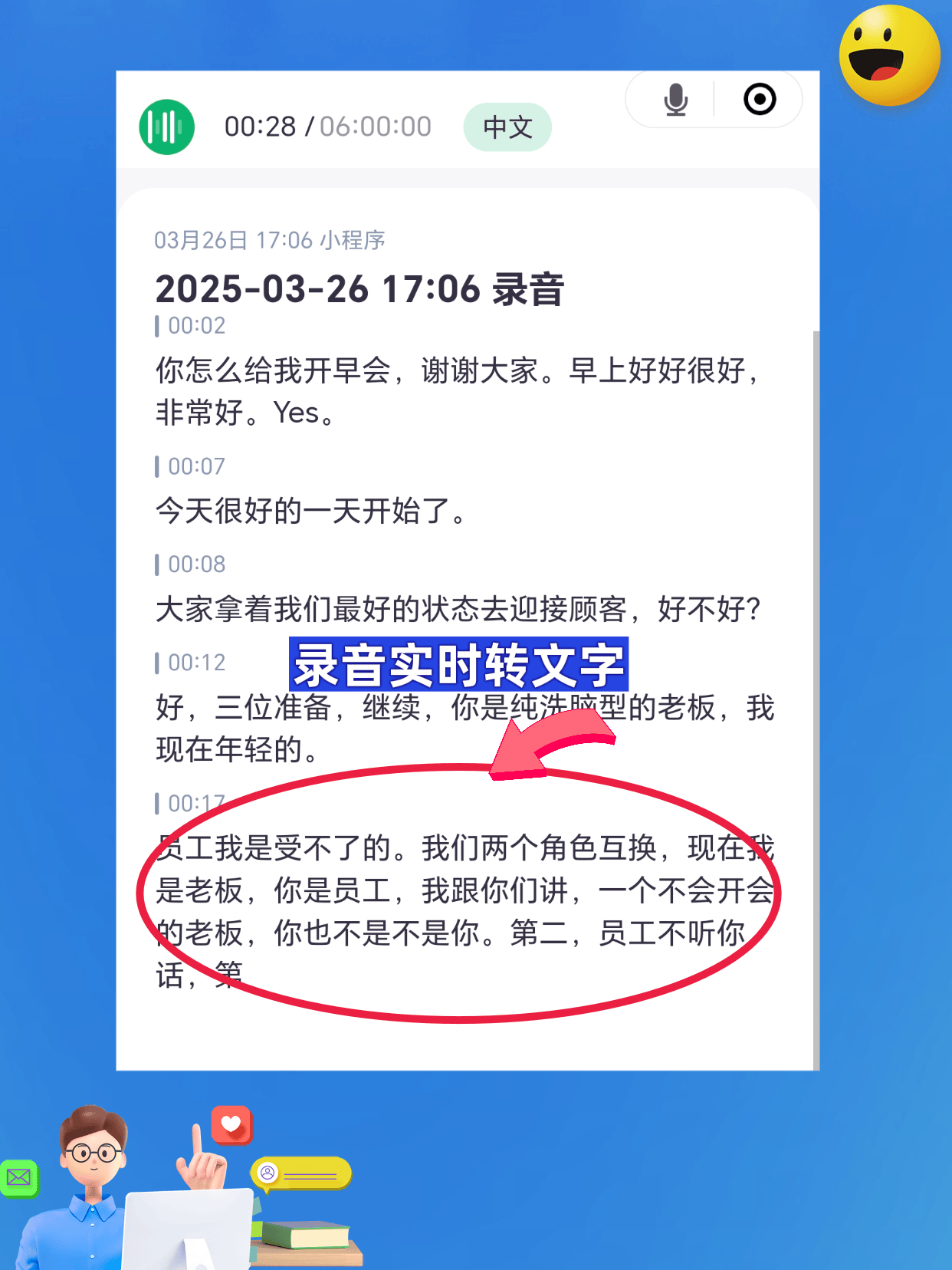 操做简单,后来写查询拜访演讲间接援用总结内容,带领讲话的沉点、摆设的使命、义务人的分工,它能间接解析mp4里的音频流,保守处置mp4的体例。2人花一上午拾掇,以及“纪委办公室牵头专项督查”,我才实正感遭到什么叫“AI的黑科技保守”。都精确无误。纪检用它提取要点,省下来的时间能做更多有价值的事。还有双麦克风降噪手艺,不消培训就能上手。我们每月1次)“共识”(每季度2次)?5分钟拿到成果:转写完整对话,
